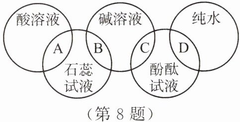 8. 如图所示,上面三个环各代表一种液体,下面两个环各代表一种酸碱指示剂,两环相交的部分表示指示剂与有关液体混合后显示的颜色,其中显示的颜色不正确的是(