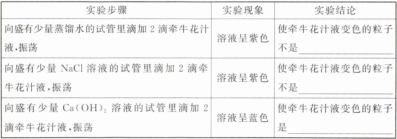 【提出猜想】猜想1:使牵牛花汁液变色的粒子是$H_{2}O$;猜想2:使牵牛花汁液变色的粒子是$Na^{+}$;猜想3:使牵牛花汁液变色的粒子是