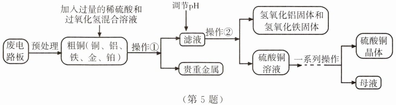 $5.(1)Al^{3+}、$$Fe^{3+} (2)Cu+H_{2}SO_{4}+H_{2}O_{2}=CuSO_{4}+2H_{2}O$