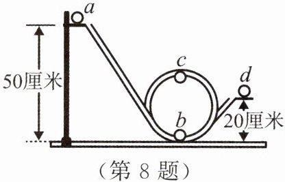 8. 如图所示,质量为 40 克的金属小球从导轨的 $ a $ 处自由滑下,依次经过 $ b $ 处、$ c $ 处,到达 $ d $ 处时恰好停下。在从 $ a $ 处到 $ b $ 处的过程中,重力做功为