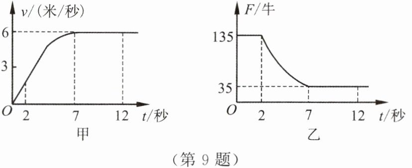 9. 电动自行车已成为一种大众化的交通工具。小明用家里的电动自行车进行了测试,他骑着车在平直的路面上由静止开始运动,分别获得如图甲、乙所示的速度随时间变化的关系图像和牵引力随时间变化的关系图像。