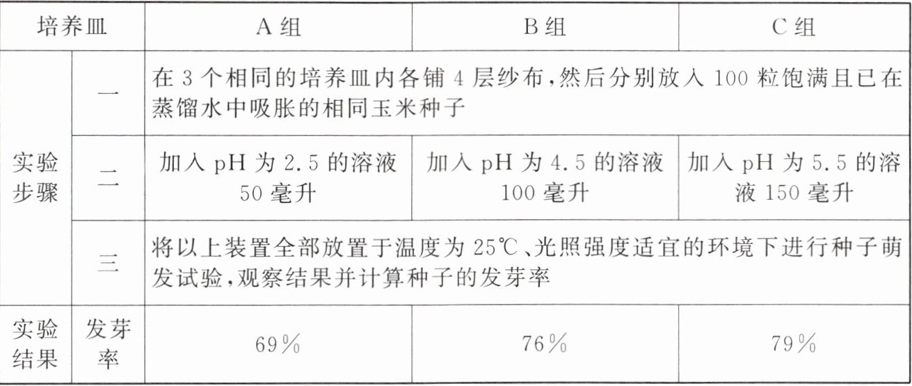8. 某研究性学习小组的成员就酸雨(pH 小于等于 5.6 的降水)对农作物种子萌发的影响做了以下探究实验。