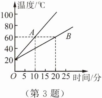 3. 用两个完全相同的电加热器分别给A、B两种液体加热,绘制它们的温度随时间变化的图像,如图所示。