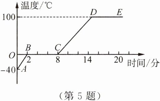 5. 小红给冰加热,她记录了冰熔化成水直到沸腾的过程中的数据,绘制成如图所示的温度随时间变化的图像。分析图像发现,造成AB段和CD段升温快慢不同的原因是________________。已知冰的比热容是2.1×10³焦/(千克·℃),在给100克冰加热的2分钟内,冰吸收的热量为______。
