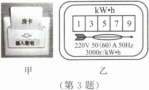 3. 如图甲所示为宾馆的房卡,把房卡插入槽中,房内的用电器才能工作。插入房卡相当于闭合电路中的