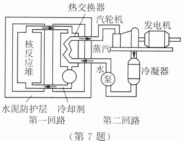 7. 核电站的核心是反应堆。反应堆以铀为核燃料,放出的核能转化为高温蒸汽的内能,再通过发电机转化为电能。如图所示为核电站的原理示意图:第一回路中的水或其他液体被泵压入反应堆,在那里被加热,然后进入热交换器,把热量传给第二回路的水后又被泵压回到反应堆里。在热交换器内,第二回路中的水经加热变成高温高压蒸汽,被送入汽轮机并驱动汽轮机,做功后蒸汽温度和压强都降低,随后进入冷凝器,最后又由水泵把它压回热交换器,高速旋转的汽轮机带动发电机发电。