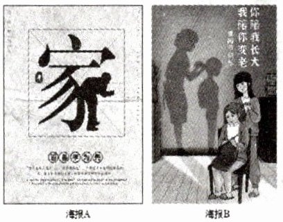 示例一:A 理由一:"家"字右下角的撇捺由一个弯腰的老人组成,说明老人是一个家的重要支撑,老人幸福,家庭才幸福。理由二:"百善孝为先"点出海报主题,直接号召大家孝亲敬老。示例二:B 理由一:图片中女儿为年迈的妈妈梳头的场景与妈妈为年幼的女儿梳头的影子相互映衬,照应文字内容。理由二:"你陪我长大,我陪你变老"点明陪伴就是最好的尽孝方式,契合"孝亲敬老"的主题。