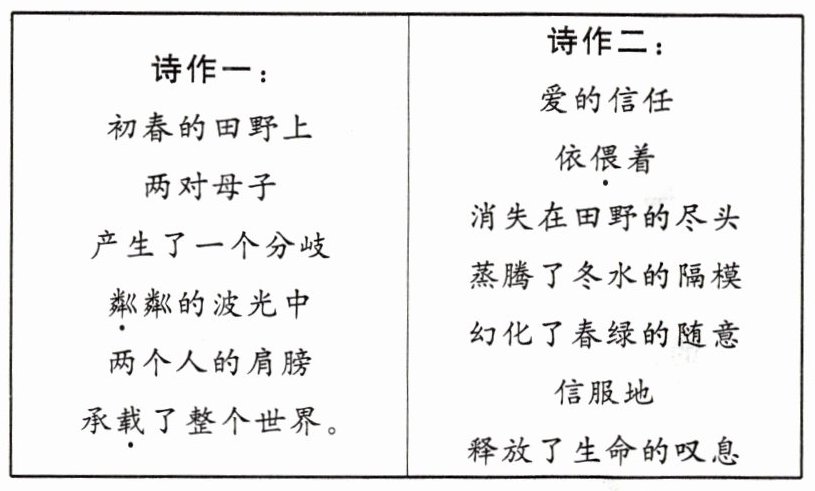 1. 校文化社开展征文活动,小语和小文受《散步》一文的启发,想要将自己的感悟以诗歌的形式呈现并进行投稿,请你阅读后,帮他们把把关。