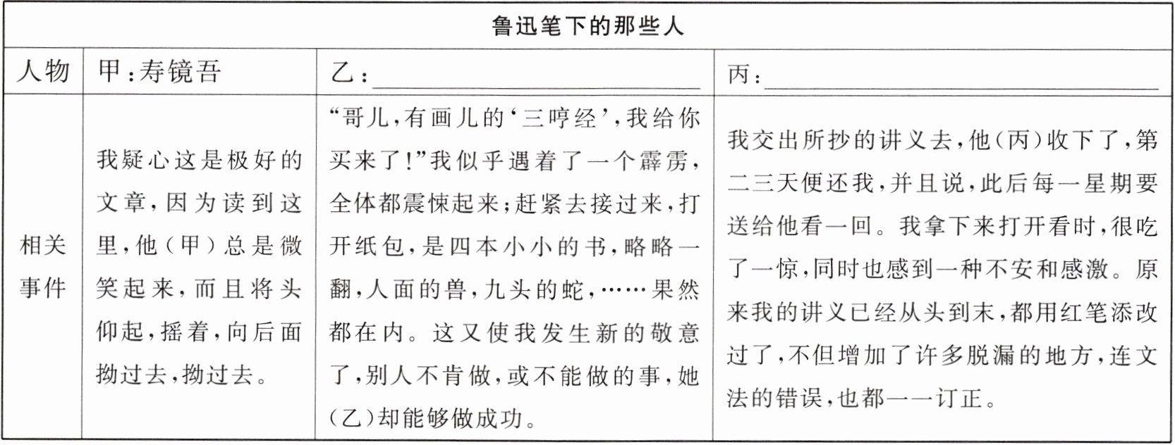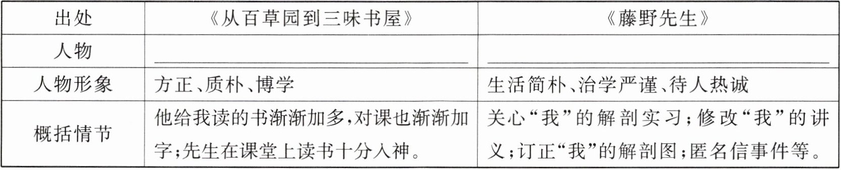 2. 在鲁迅先生的一生中,有三位老师对他影响深远。其中包括在《朝花夕拾》中提到的以下两位。下面是一个同学的阅读笔记,请你根据阅读内容把表格补充完整。