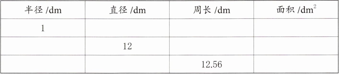| 半径/dm | 直径/dm | 周长/dm | 面积/dm² |