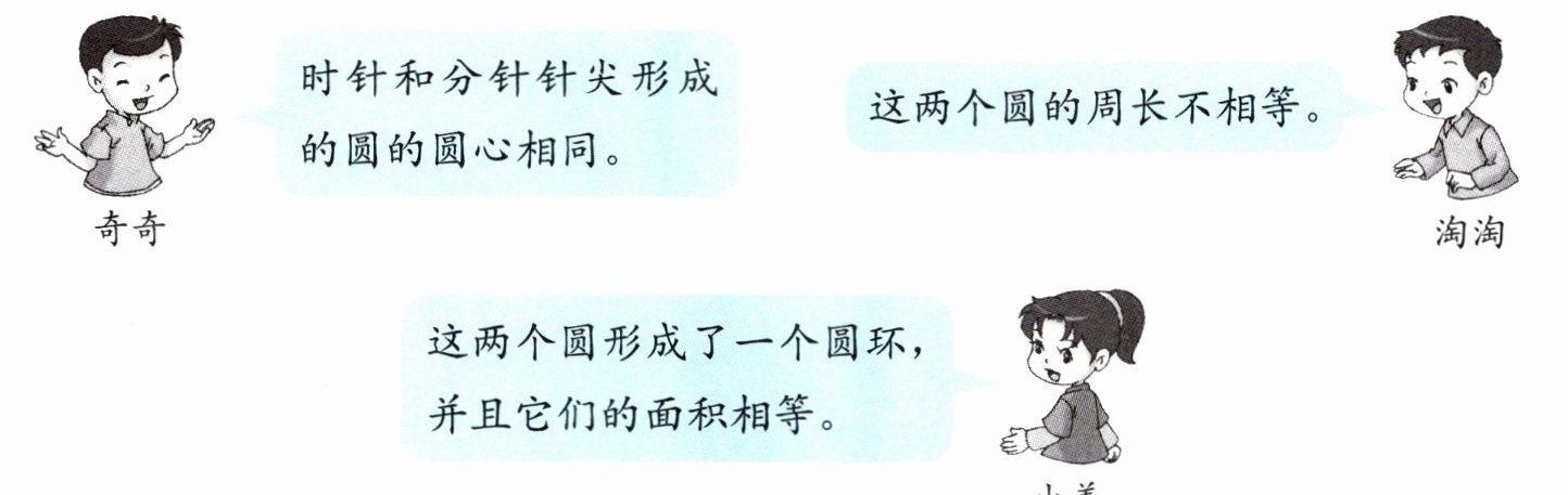 1. 时针和分针转动一周,针尖的轨迹都是圆,淘淘、小美和奇奇对这两个圆进行了分析,(