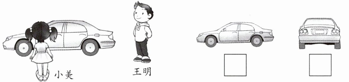 1. 请你在王明看到的图下面画“△”,在小美看到的图下面画“○”。