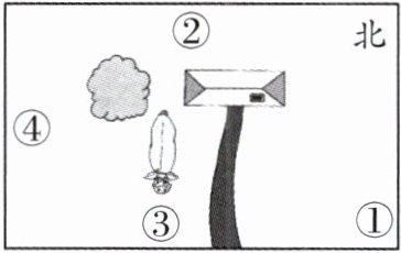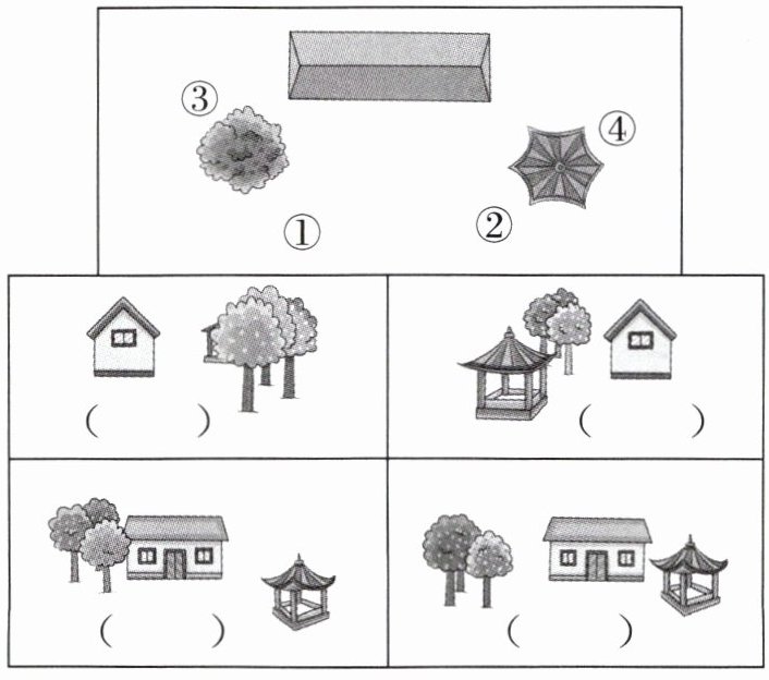 3. 下面的照片是在空中看到的公园,房子周围有一个亭子、一片树林。下面四幅画面分别是站在①②③④哪个位置看到的?
