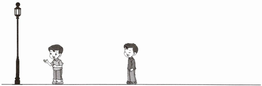 左边的小朋友:由于光源在左上方向(相对于小朋友),影子会在小朋友的右下方。从路灯顶部画一条线经过左边小朋友的头部并延伸到地面,此为影子的一部分,继续以类似方式确定影子的轮廓,影子长度从脚部向右延伸一定长度。