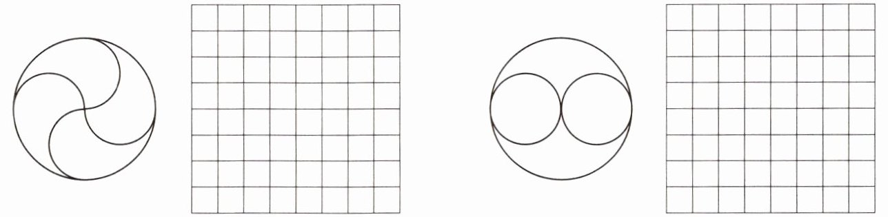 对于第三个两圆相交图案,在第二个空方格图中画出其关于某条竖直线轴对称的图案(找出各关键点关于对称轴的对称点,再连接各对称点得到对称图形)。
