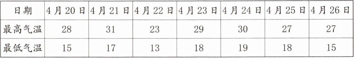 1. 某市2022年4月20~26日最高和最低气温统计表如下。(单位:℃)