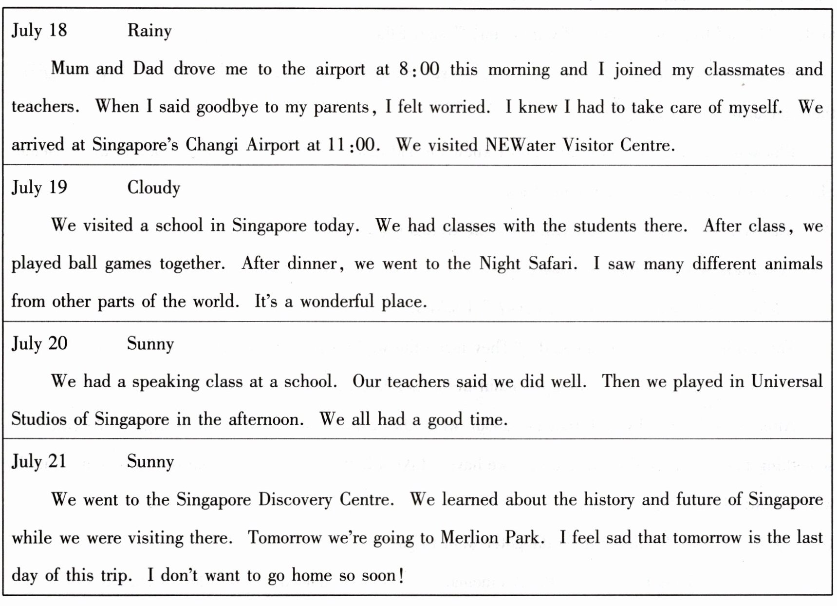 ) 3. How long was the writer's trip in Singapore?A. Three days. B. Four days. C. Five days. D. Six days.