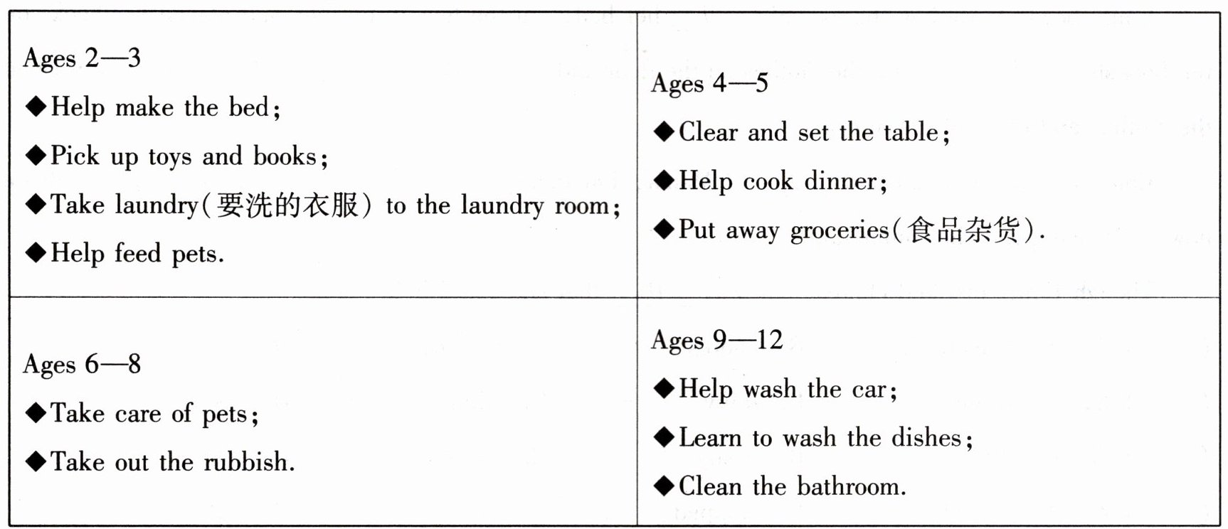 In America, there are chores for children of different ages. American people think it's important to tell children their duty in the family. Use this list of age chores for your children.