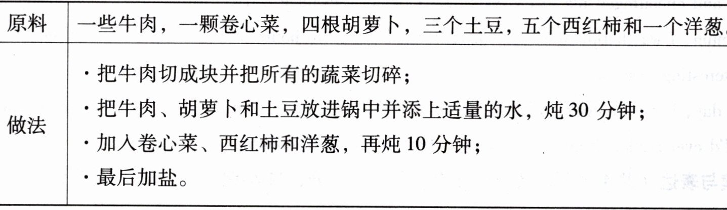 45. 根据下面的表格提示写一篇英语短文,介绍一下罗宋汤(Russian soup)的做法。