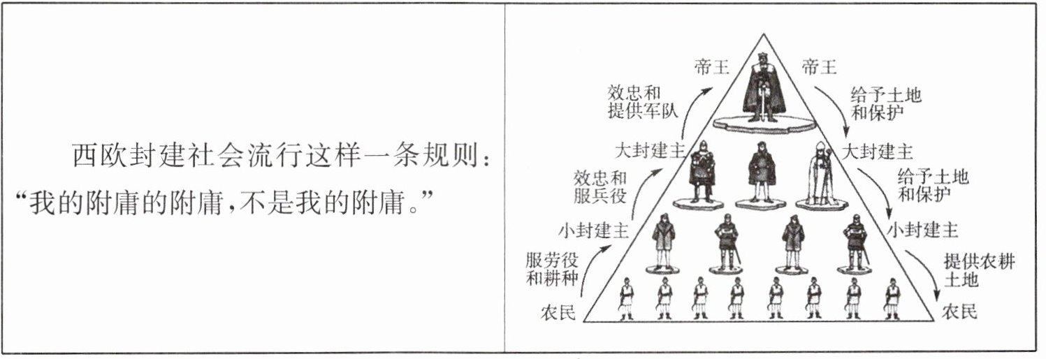 3. “一个制度”:封君封臣制度。8世纪前期,法兰克王国对土地的分封形式进行了改革,要求得到封地的人必须提供兵役服务,这样,赐地的人成为封君,接受封地的人则成为封臣,封臣必须效忠于封君,封君则须保护封臣的观念日益流行开来,11世纪时,这种以土地的封赐为纽带而形成的封建制度在西欧已经普遍存在。