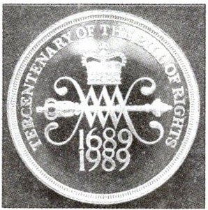 材料二:下图所示为《权利法案》颁布 300 周年纪念币——权杖被丝带束缚