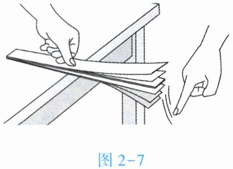 12. 如图 2 - 7 所示,将一把钢尺紧按在桌面边缘。先将尺的一半伸出桌面,用力拨动钢尺,听它振动发出的声音;再增加尺伸出桌边的长度,用相同的力拨动钢尺,听到的声音【