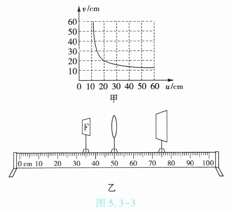 (2)通过探究记录,绘制了像距v与物距u之间的关系图像,如图5.3-3甲所示,则该凸透镜的焦距是