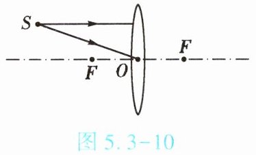 7. (★★)如图5.3-10所示,点光源S位于凸透镜一侧。在图中画出S发出的两条光线通过凸透镜后的折射光线,并标出点光源发出的光经凸透镜后所成的像点S'。