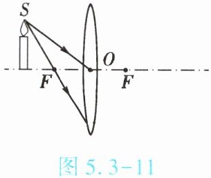5. (★★)如图 $5.3-11$ 所示,请画出发光点 $S$ 经凸透镜后的出射光线,并确定发光点 $S$ 的像点 $S'$。