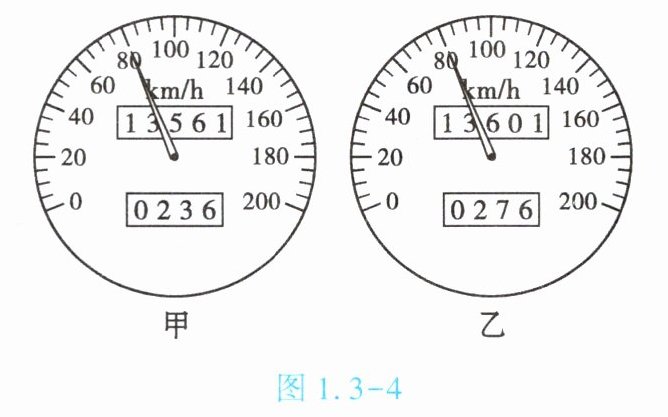 km/h;该车匀速行驶了一段时间之后,表盘示数如图 1.3 - 4 乙所示,那么这段时间为0.5