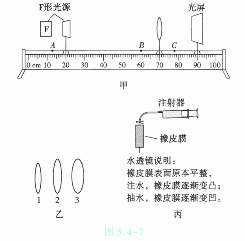 (2)用如图5.4-7丙所示的水透镜模拟近视眼镜矫正视力。应将水透镜置于光具座上的
