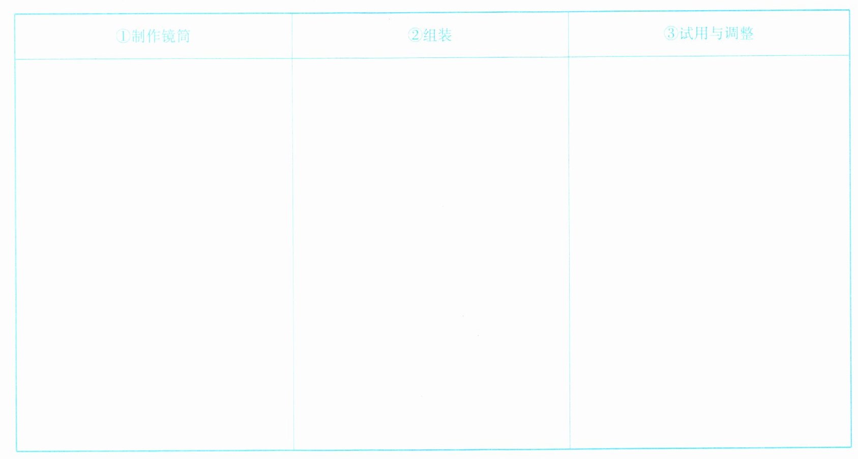 @@【解析】:①制作镜筒:取两个长度不同的圆筒(如纸筒),确保内壁光滑,长筒作为物镜镜筒,短筒作为目镜镜筒,短筒直径略小于长筒,可插入长筒内滑动。②组装:将焦距较长的凸透镜固定在长筒一端作为物镜,焦距较短的凸透镜固定在短筒一端作为目镜,把短筒插入长筒,使两透镜中心在同一直线上。③试用与调整:对准远处物体,前后移动短筒调整目镜位置,直至看到清晰的像。
