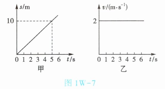 7. (★★★)如图 1W - 7 所示,图甲是小车甲运动的 $ s - t $ 图像,图乙是小车乙运动的 $ v - t $ 图像,由图像可知【