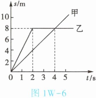6. (★★★)甲、乙两辆车同时从同一地点向东做直线运动,其 $ s - t $ 图像如图 1W - 6 所示,请根据该图像提取合理信息。示例:甲车做匀速直线运动。