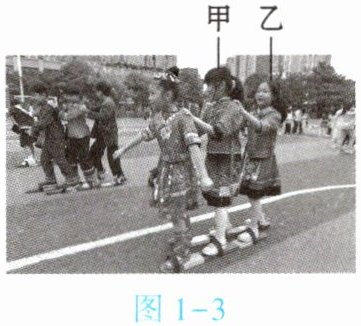 4. (★★)学校的趣味运动会丰富多彩,其中“三人板鞋”竞速项目深受大家喜爱。如图1 - 3所示,甲、乙、丙三位同学正在进行“三人板鞋”竞速活动,如果说甲同学是静止的,所选的参照物是【