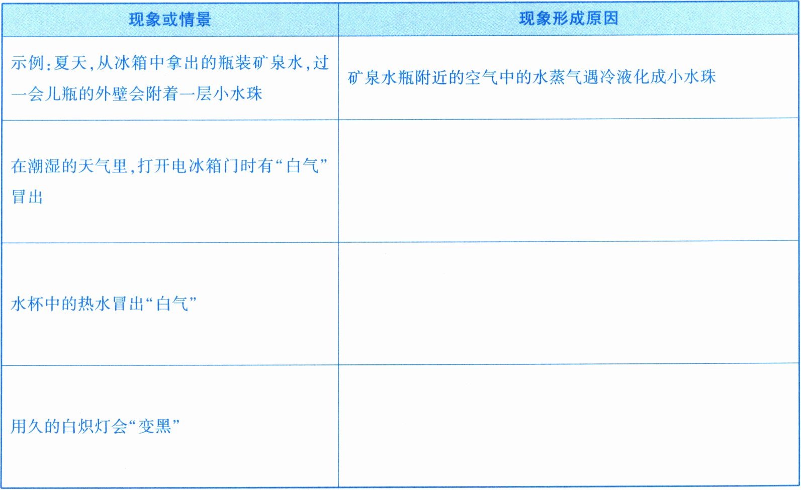 |示例:夏天,从冰箱中拿出的瓶装矿泉水,过一会儿瓶的外壁会附着一层小水珠|矿泉水瓶附近的空气中的水蒸气遇冷液化成小水珠|