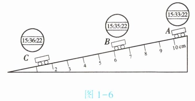 8. (★★★)小华在“测量小车的平均速度”的实验中,设计了如图1 - 6所示的实验装置,小车从带刻度(分度值为1cm)的斜面顶端由静止开始下滑,图中圆圈内数字是小车到达A、B、C三处时电子表的示数。(电子表数字表示为“分:秒:毫秒”)