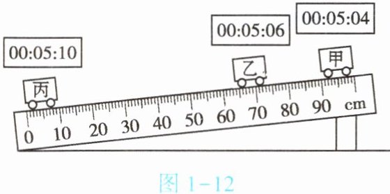 8. (★★★)某物理兴趣小组利用带有刻度尺的斜面、小车和电子表测量小车的平均速度,如图1 - 12所示,图中显示的是测量过程中的小车在甲、乙、丙三个位置及其对应时间的情景,显示时间的格式是“时:分:秒”。