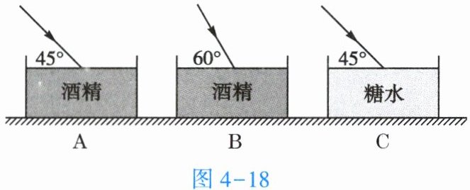 19. 在探究“光从空气斜射入糖水和酒精时,哪种液体对光的偏折本领较大”的实验中,小东按以下设计的方案进行实验,得到李老师的认可: