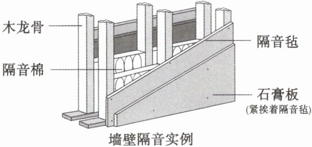 在真空中传播。墙壁和地板的隔音实例如图2.5-1所示,其中隔音棉和隔音毡应该具有疏松