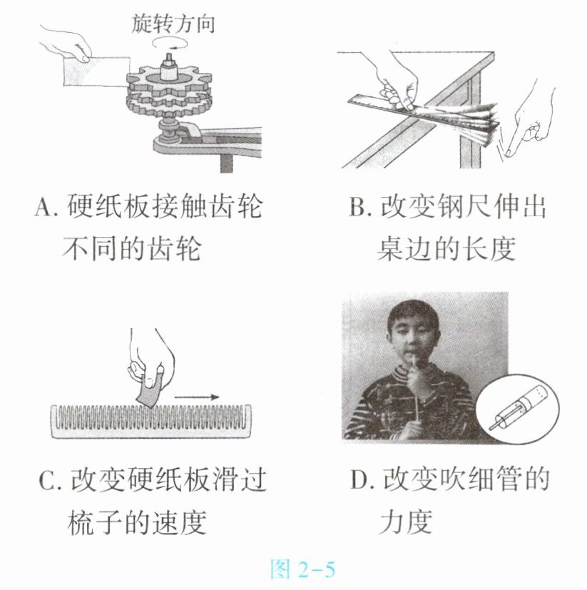 4. (★★★)为了探究音调与什么因素有关,小明设计了下面几个实验,如图2-5所示,你认为不能够完成探究目的的是【