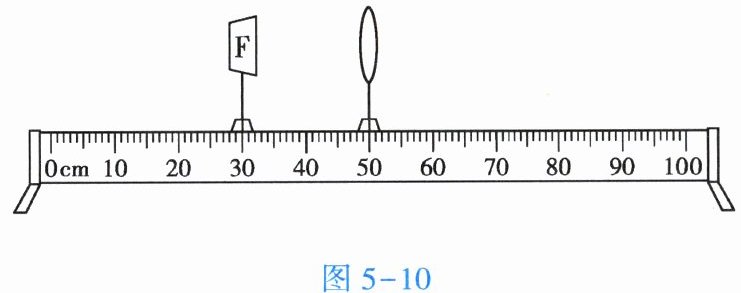 13.(双选)在“探究凸透镜成像的规律”时,F 形光源和凸透镜的位置如图 5 - 10 所示,移动光屏可承接到清晰等大的像(图中未画出光屏)。若保持透镜位置不变,将 F 形光源调至 20 cm 刻度处时,下列判断错误的是【