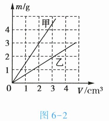 3. 甲、乙两种物质的质量与体积的关系图像如图 6 - 2 所示,由图可知,当它们体积相等时,乙的质量较