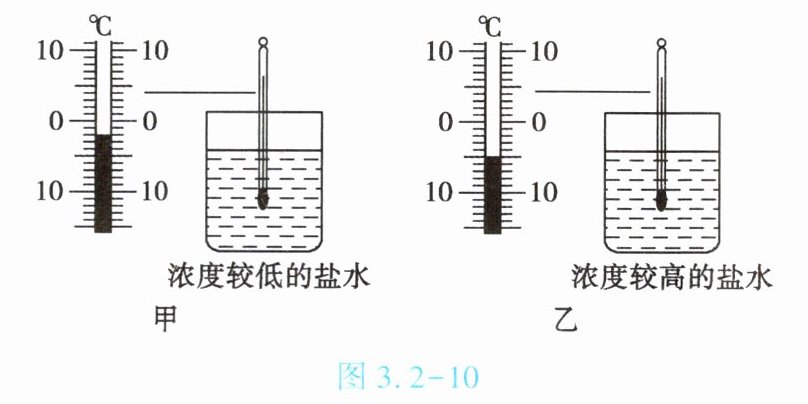 8. (★★★)环卫工人往结冰的桥面撒盐加快冰的熔化,激发了小明探究盐水凝固点的兴趣。他把两杯浓度不同的盐水放入冰箱冷冻室里,当杯内的盐水中出现冰块时测量它们的温度,温度计的示数如图3.2-10所示(每支温度计的单位都是摄氏度),图乙中温度计的示数为______℃。从实验现象可知,盐水的浓度越高,其凝固点越______。经过认真思考,小明得出盐水凝固时需要