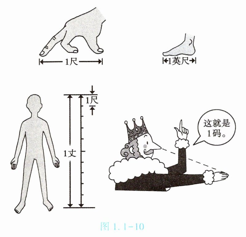 古代人度量是以人的某一部位作计量标准的,比如:将拇指和中指张开按在要求度量的物体上,就是古代的 1 尺;在英语中,“英尺”和“脚”是同一个词,查理大帝就曾郑重地宣布,1 英尺就是他的脚板长;而丈在古代是指成年男子的身高,因此直到今天,成年男子还常常被称为“大丈夫”;英国国王亨利一世则规定,1 码就是他的鼻子尖到他伸直手臂的中指尖的距离,约为现在的 0.9 m;等等。这些测量方法虽然不太精确,但简单实用,只要记住自己身体有关部位的尺寸,购物时就能徒手测量,进行估测。