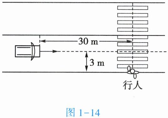 21. 研究发现:人在饮酒后驾车的应急反应时间是未饮酒时的 2~3 倍。反应时间是指司机从看到意外情况到踩刹车需要的这段时间;在反应时间内汽车要保持原速前进一段距离,这段距离叫反应距离。如图 1 - 14 所示,某人酒后驾车沿马路直线行驶,车头中央距马路边沿 3 m。在车到达某位置时,一人正从路边出发闯红灯过人行横道,此时汽车的速度为 15 m/s,距离人的行走路线为 30 m。若该司机的反应时间为 1.2 s,刹车后汽车由于惯性还要继续行驶,再经过 1 s 刚好驶到人的行走路线。