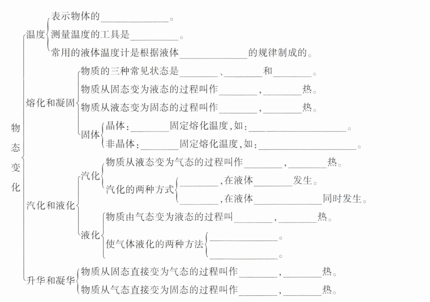 汽化和液化:汽化;吸;蒸发;表面;沸腾;表面和内部;液化;放;降低温度;压缩体积