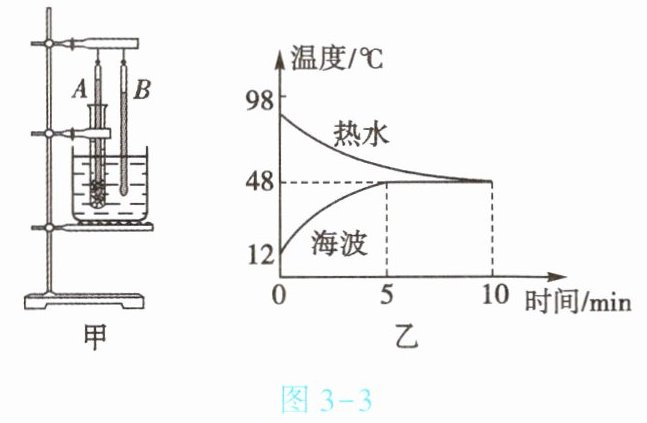 6. (★★★)(双选)小明将装有海波的大试管放在装有热水的大烧杯中进行熔化实验(如图 3-3 甲)。根据温度计 A 和 B 的示数,绘制海波和热水的温度随时间变化的图像(如图 3-3 乙)。以下说法正确的是【