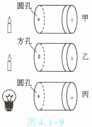 7. (★★★)学习了光学知识后,爱动脑筋的小童和小朵想自己探究小孔成像的现象,如图4.1-9所示,他们给两个空罐的底部中央分别打上一个圆孔和一个方孔,再用两片半透明的塑料膜蒙在空罐的口上,分别将小孔对着烛焰和灯丝,可以看到烛焰和灯丝通过小孔所成的像。