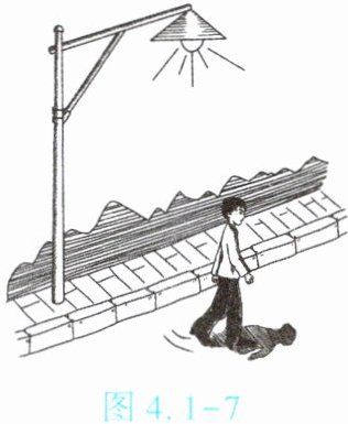 5. (★★★)晚上,当你由远及近从一路灯下经过、再走远时,如图4.1-7所示,你的影子的长短变化是【